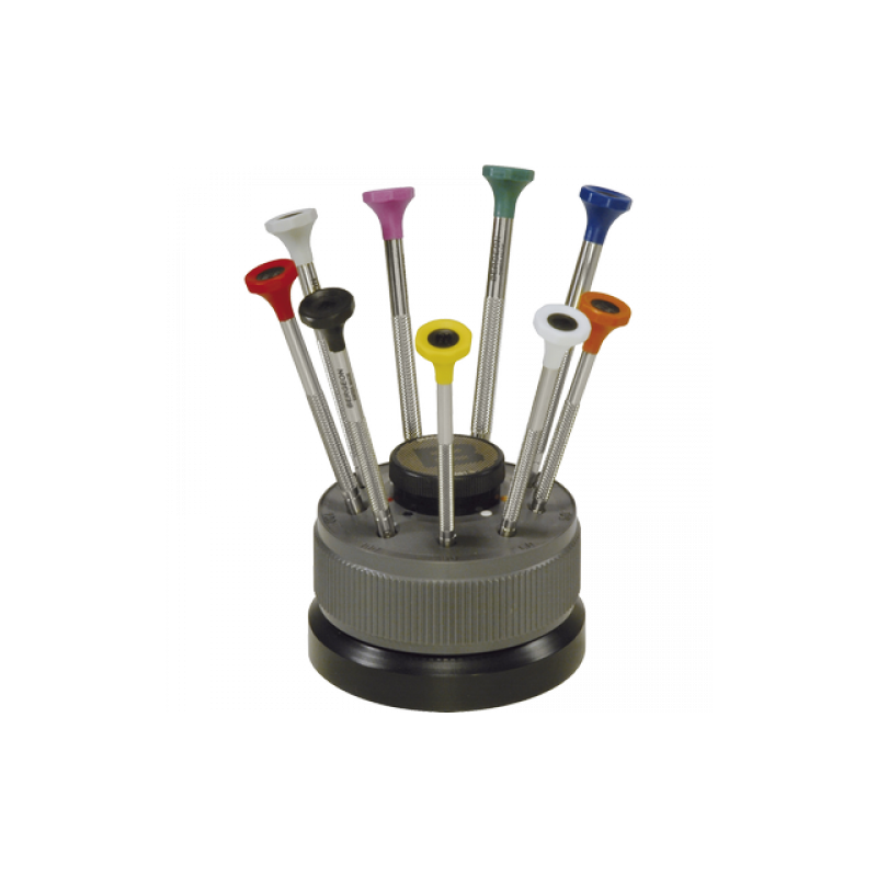 Cacciaviti con corpo zigrinato in acciaio inox, cuscinetto a sfere su zoccolo rotante, lame di ricambio per ogni diametro, testa poggia dito in delrin "POM" colorati per una facile individuazione, diametri presenti, 0,50-0,60-0,80-1,00-1,20-1,40-1,60-2,00-2,50.