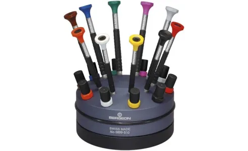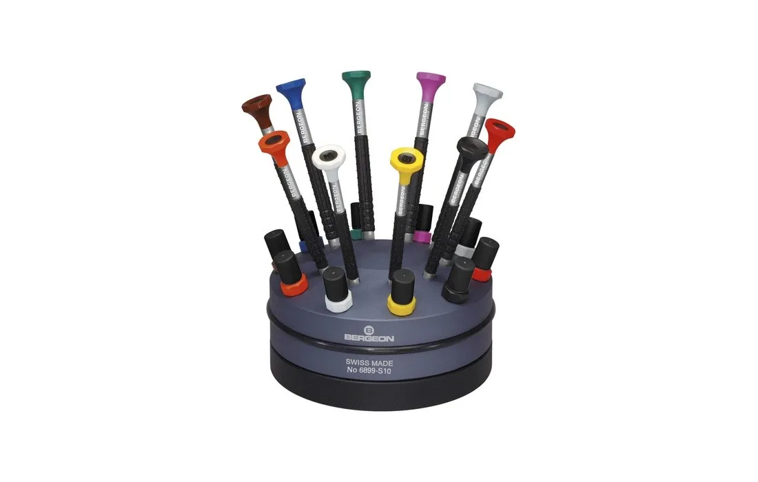 Zoccolo girevole con 10 cacciaviti ergonomici, corpo in alluminio anodizzato con punte di ricambio; la versione in acciaio la ref 0806899-s10 € 229