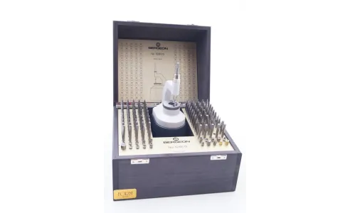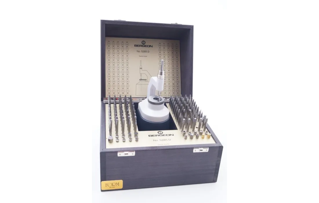 Punzoniera Bergeon 100 punzoni più 20 tasselli disco forato in acciaio temperato con zoccolo per contropunzone con fissaggio a vite scatola in legno di faggio