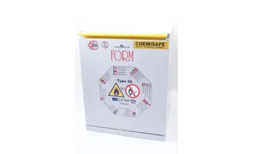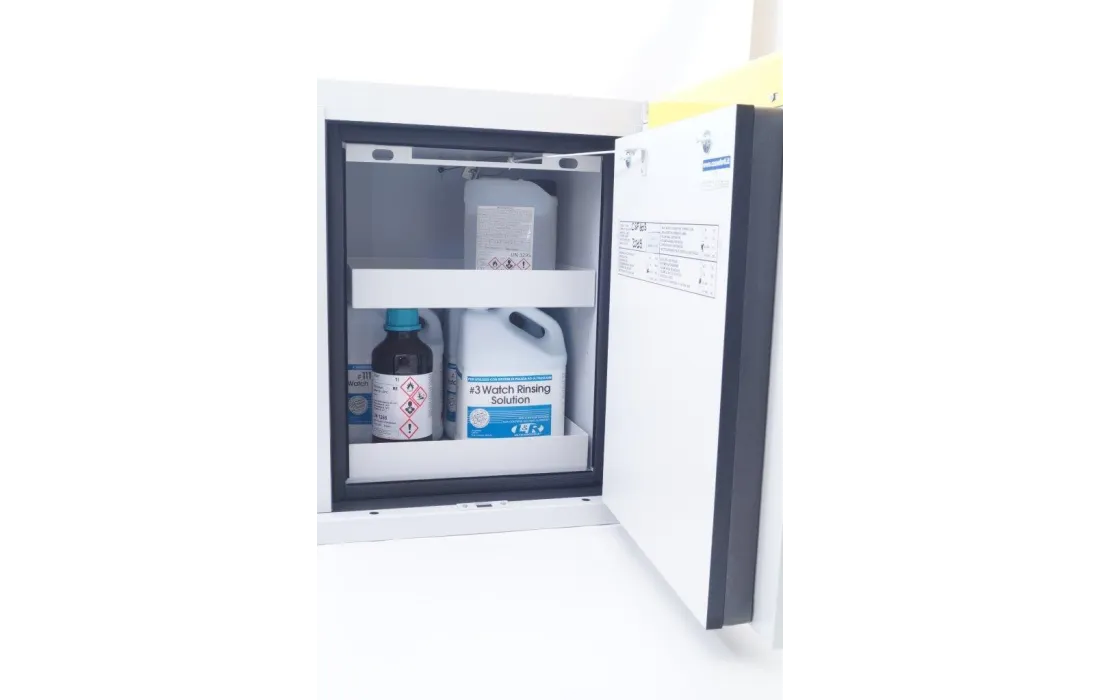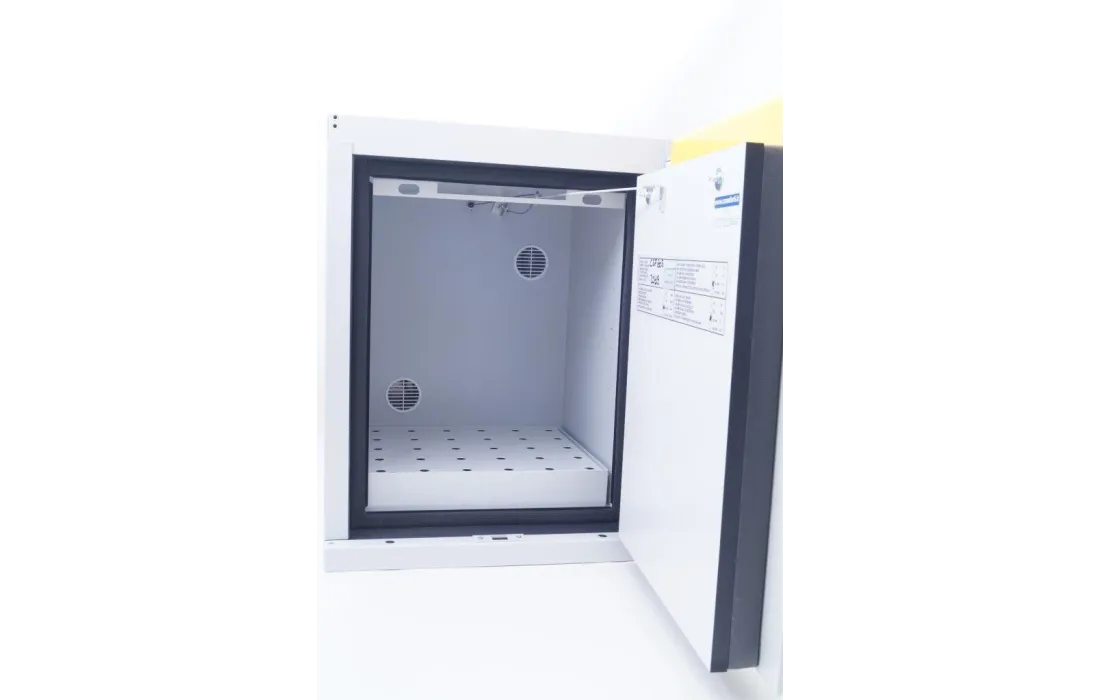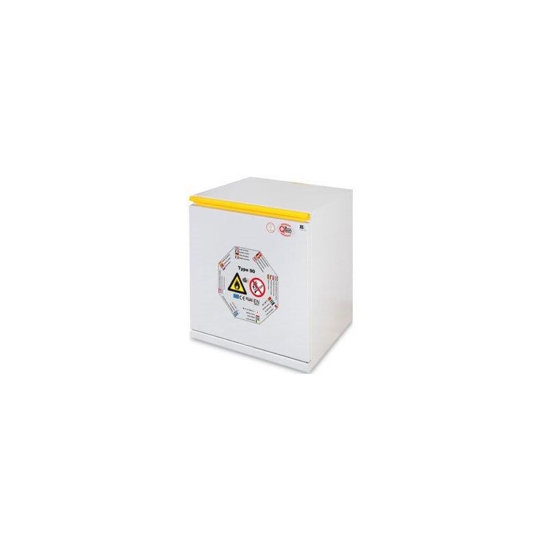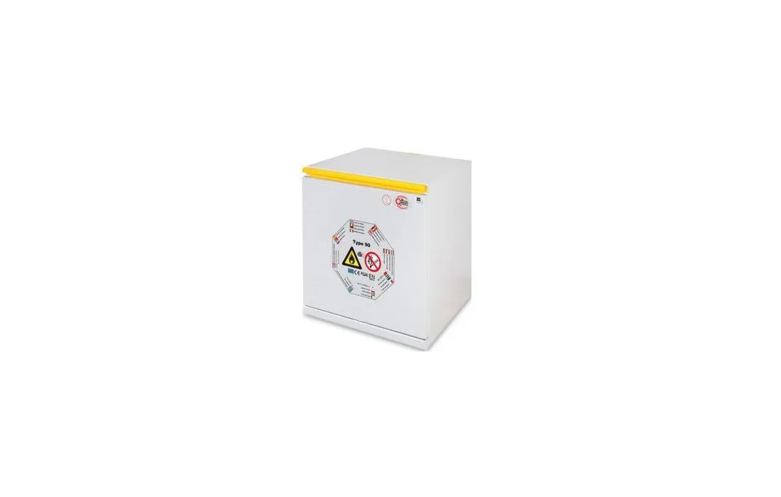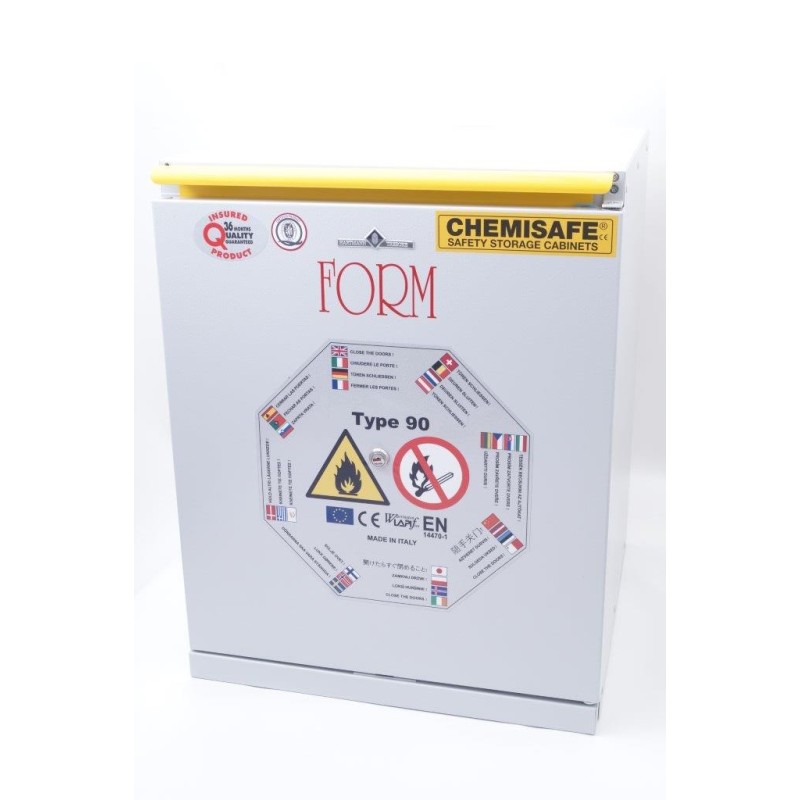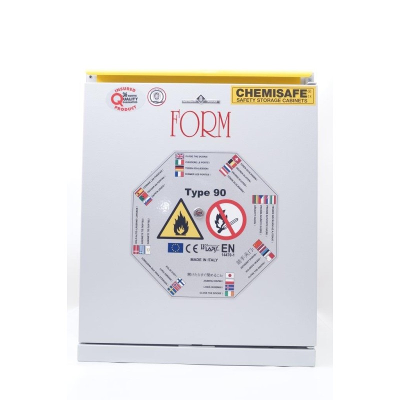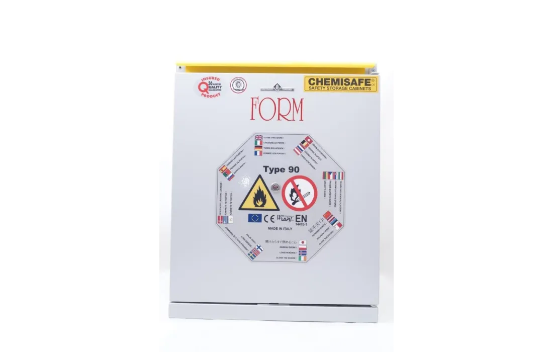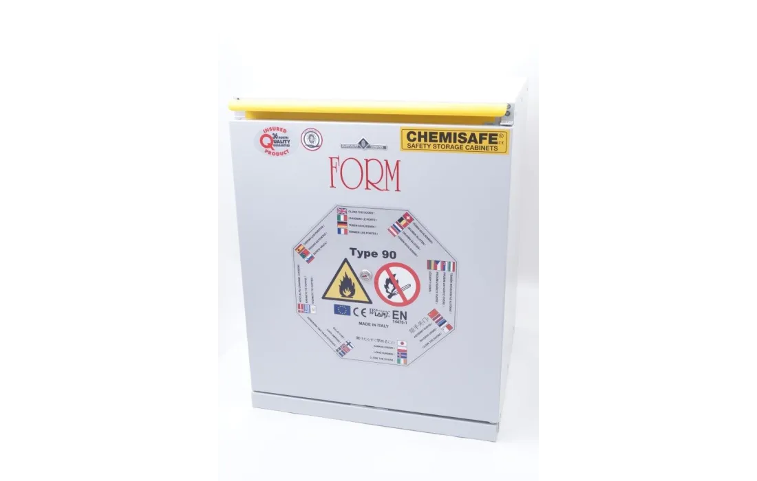 Armadio di sicurezza per lo stoccaggio di sostanze infiammabili uni en 14470-1 tipo 90. ( inalterabile per 90 minuti a 800°) Realizzato in lamiera di acciaio pressopiegata a freddo con spessori da 1/1,5 e 2 mm, verniciata con polveri epossidiche antiacido e passaggio in galleria termica a 200°C. Una particolare coibentazione con calcio silicato su pannelli per alta temperatura (800°C) in fibra minerale fissati con collanti ceramici. Elevata resistenza ai vapori aggressivi.