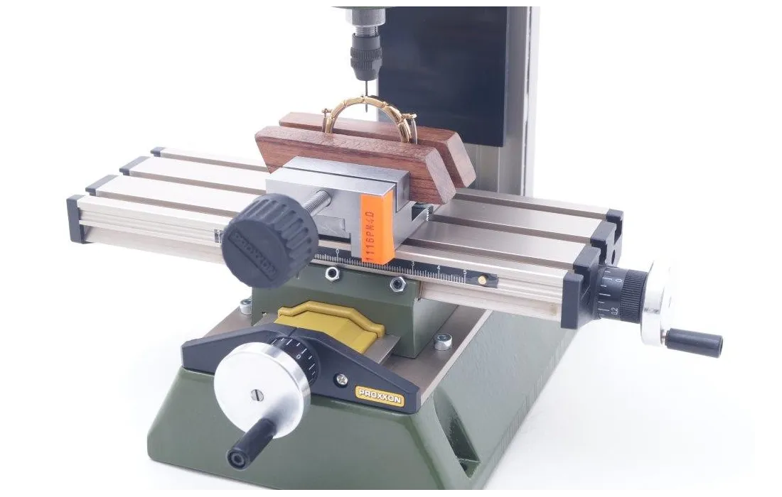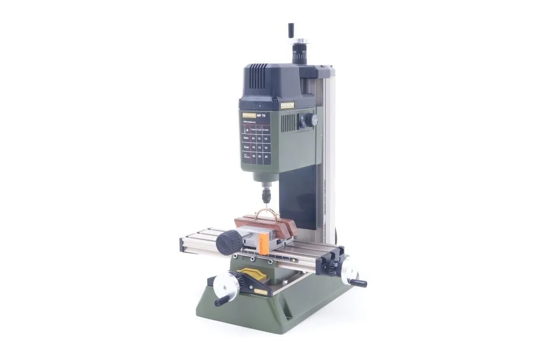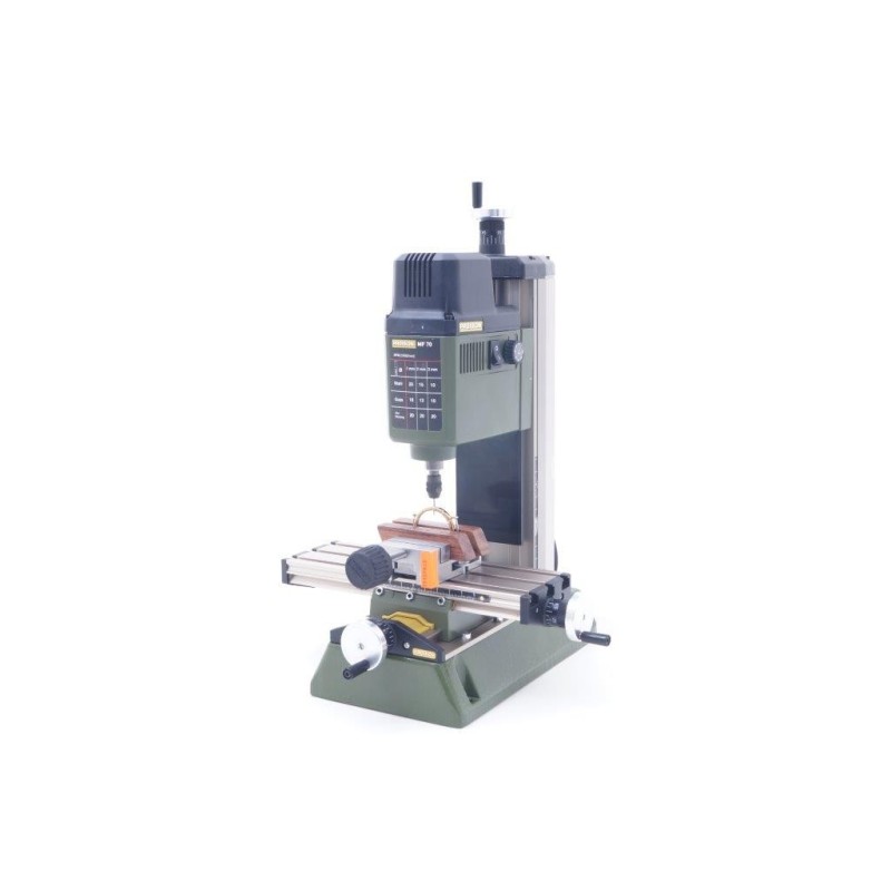 Fresatrice verticale di precisione per i lavori più fini; ideale per laboratori, orologiai e gioiellieri. Stabile basamento in ghisa grigia, guida verticale e tavolo a croce in duralluminio ad elevata densità superficiale. Guide a coda di rondine prive di gioco e ritarabili su ambedue gli assi. Cassa del supporto motore in pressofusione d'alluminio con speciale motore bilanciato a 24 poli per lavori senza vibrazioni ad elevata velocità con frese estremamente piccolo. Serraggio utensili tramite pinze di serraggio del sistema MICROMOT (in acciaio temperato a tre sezioni) in dotazione una di ogni diametro: 1 - 1,5 - 2 - 2,4 - 3 - 3,2. Piano di lavoro con 3 scanalature passanti a T (a norma MICROMOT 12 x 6 x 5 m/m). Un righello graduato spostabile facilita il posizionamento della slitta trasversale. Tutti i volantini hanno un'anello graduato azzerabile (1 giro = 1m/m - 1 tacca = 0,05 m/m). Le staffe di serraggio sono in dotazione, non è compreso il morsetto porta pezzi raffigurato.