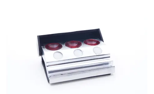 Porta olio a tre scomparti con vaschette in vetro colorato coperchio in plastica, 3 alloggiamenti porta oliatori in sambuco