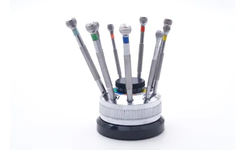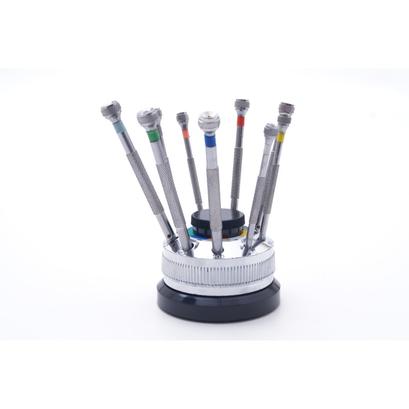 Serie di 9 cacciaviti su zoccolo girevole con punte di ricambio, struttura in plastica cromata