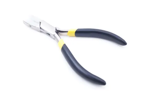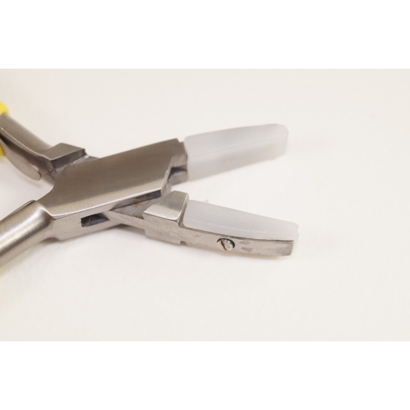 Pinza in acciaio con molle di ritorno e manici ricoperti in gomma; becchi in teflon piatti; adatta per bloccare oggetti senza il rischio di rigare.