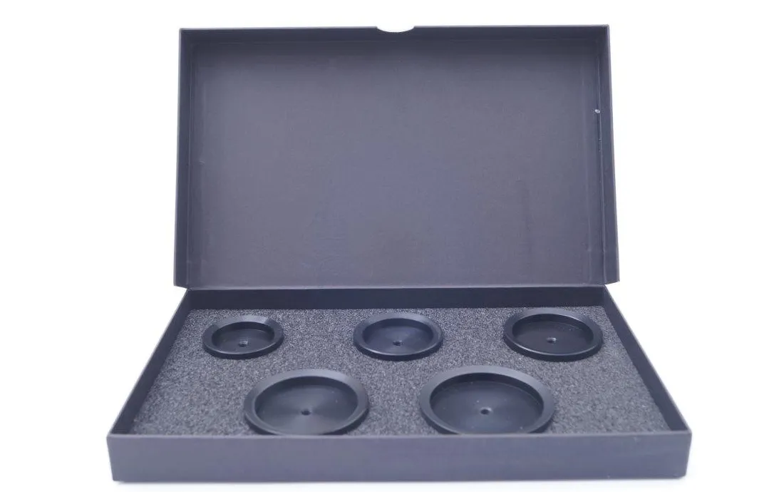 Serie di cinque tasselli in POM nero lucido di grosso diametro.