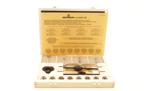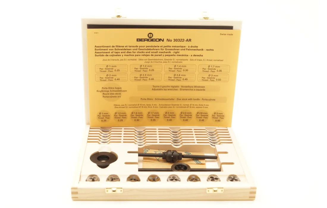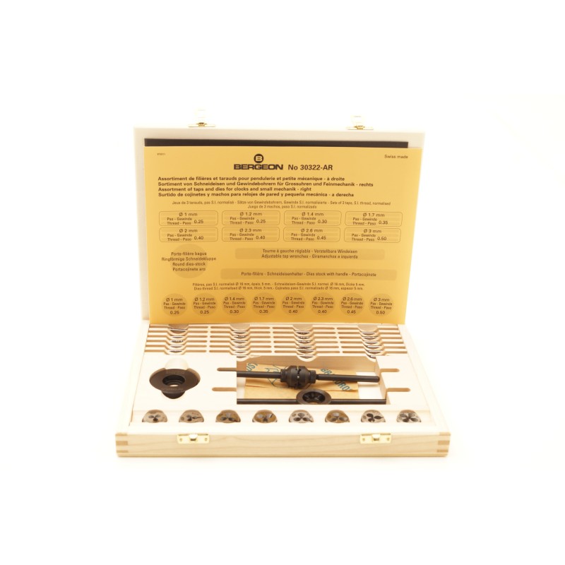 8 filiere da diam. 1 a 3 m/m 24, maschi da 1 a 3 m/m, 1 porta filiera, 1 porta filiera con manico, 1 gira filiera sinistro regolabile.