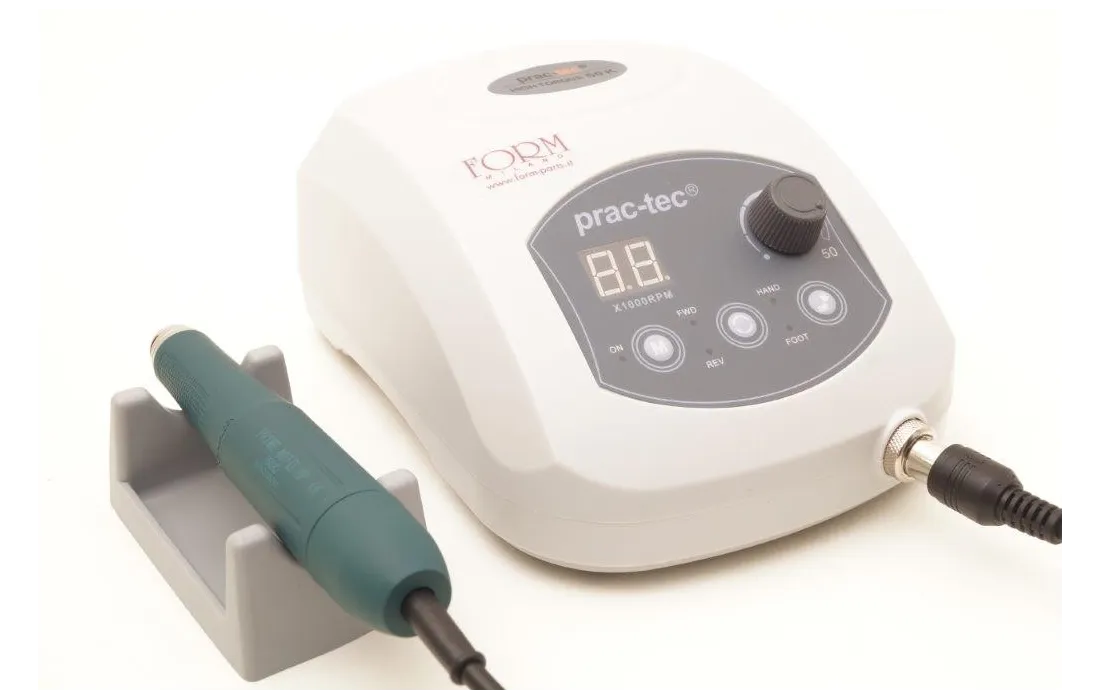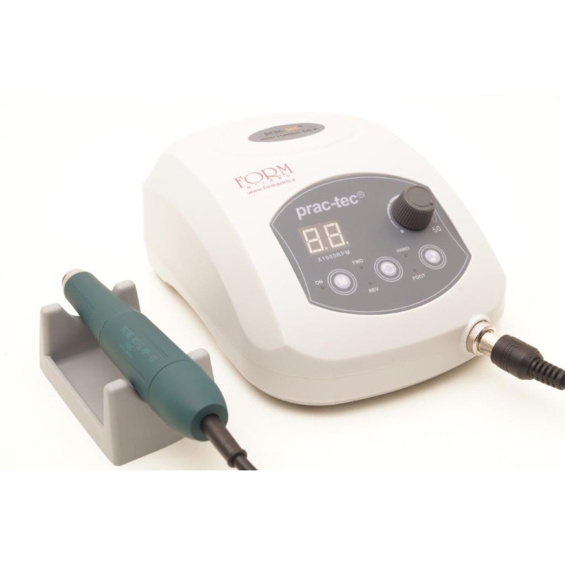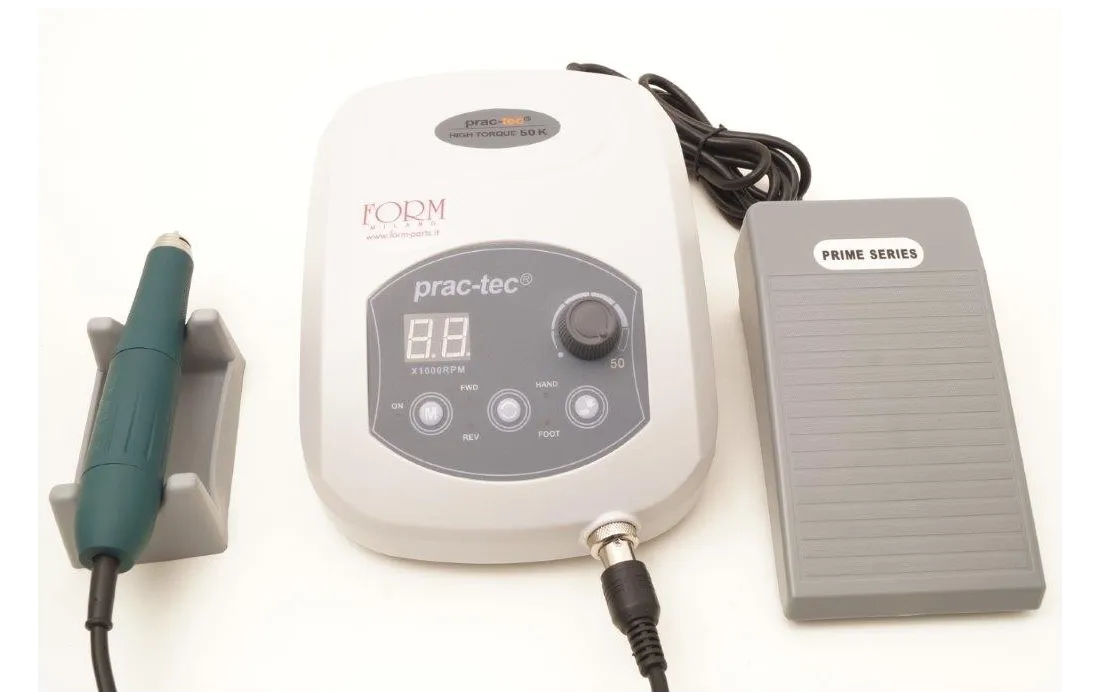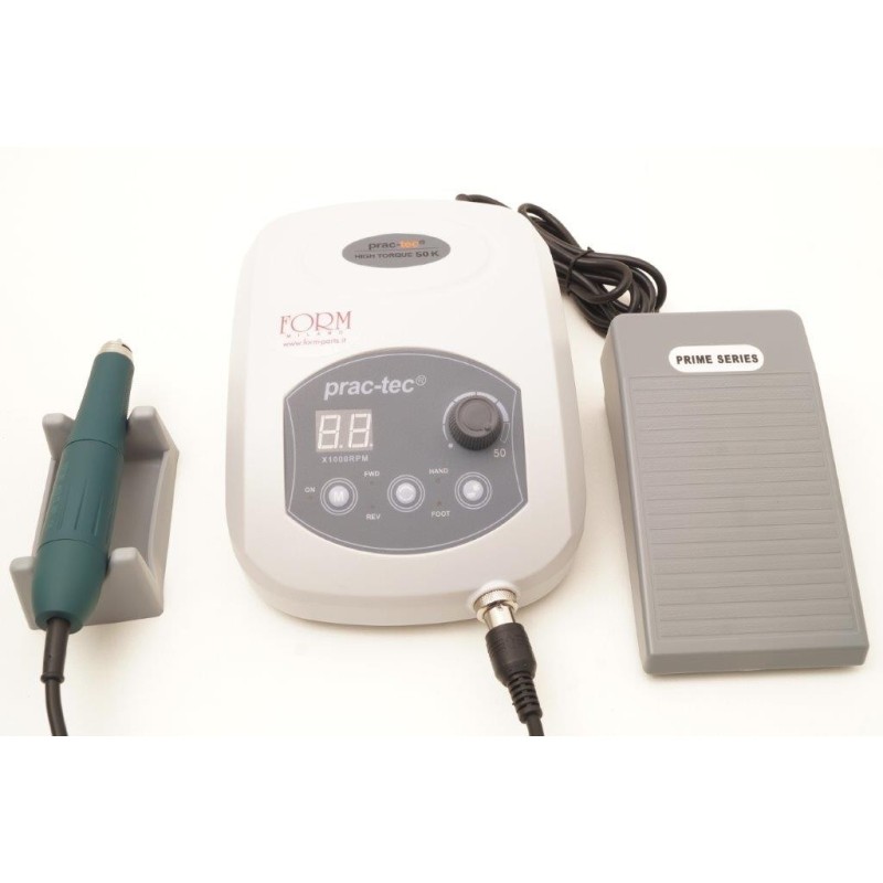 Prac-tec. Dispaly LCD, rotazione destra e sinistra variabile in entrambi i sensi da 0 a 50.000 giri "RPM" sia tramite pulsante rotativo manuale che con pedale.