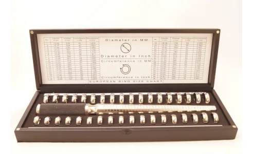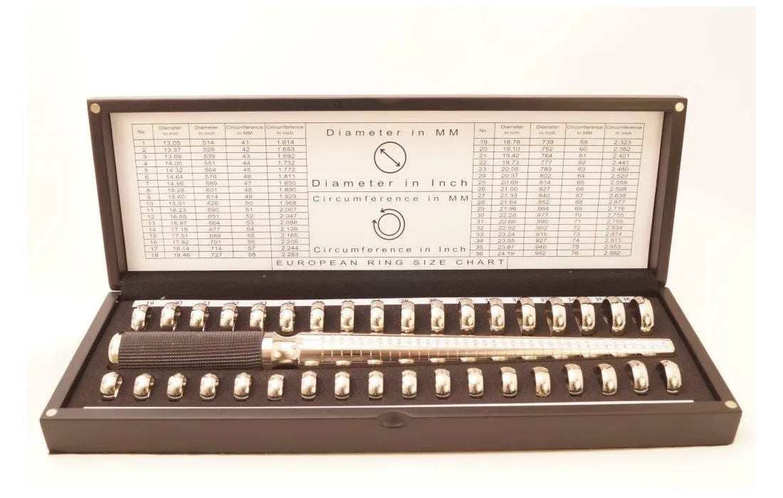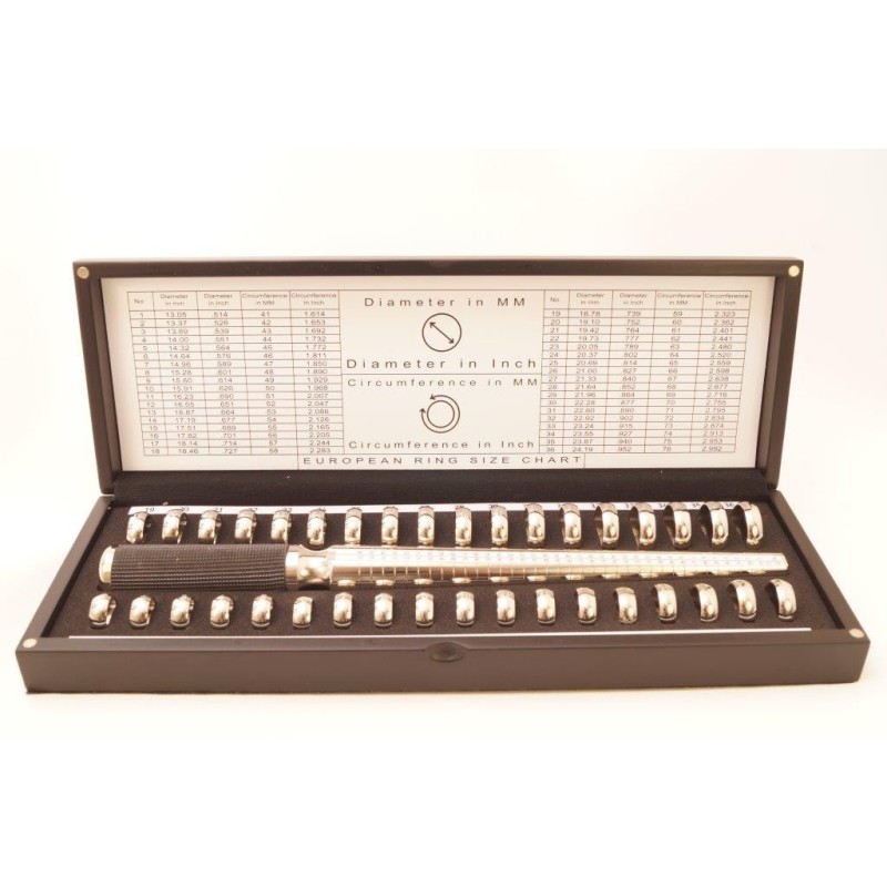 Anelliera ad anelli singoli e fuso in metallo cromato lucido, impugnatura ergonomica gommata, 36 anelli misure europee, scatola in legno laccato nero 34 x 11 x 4 cm