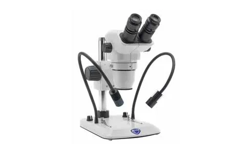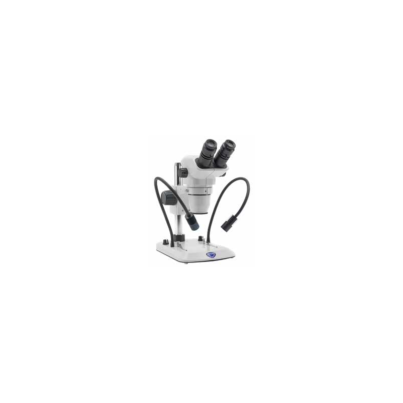 Microscopio con ottica binoculari mobili, messa a fuoco a cremagliera tramite manopola lato destro e sinistro, duplicatori di ingrandimenti sempre regolabili con manopola destra e sinistra.