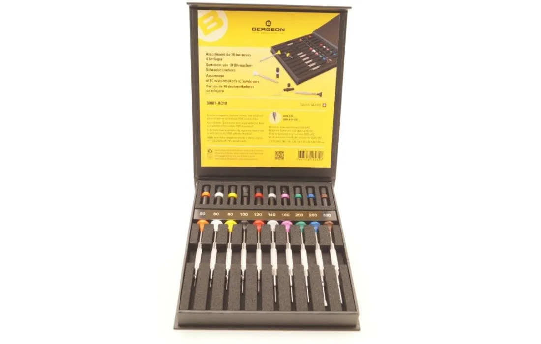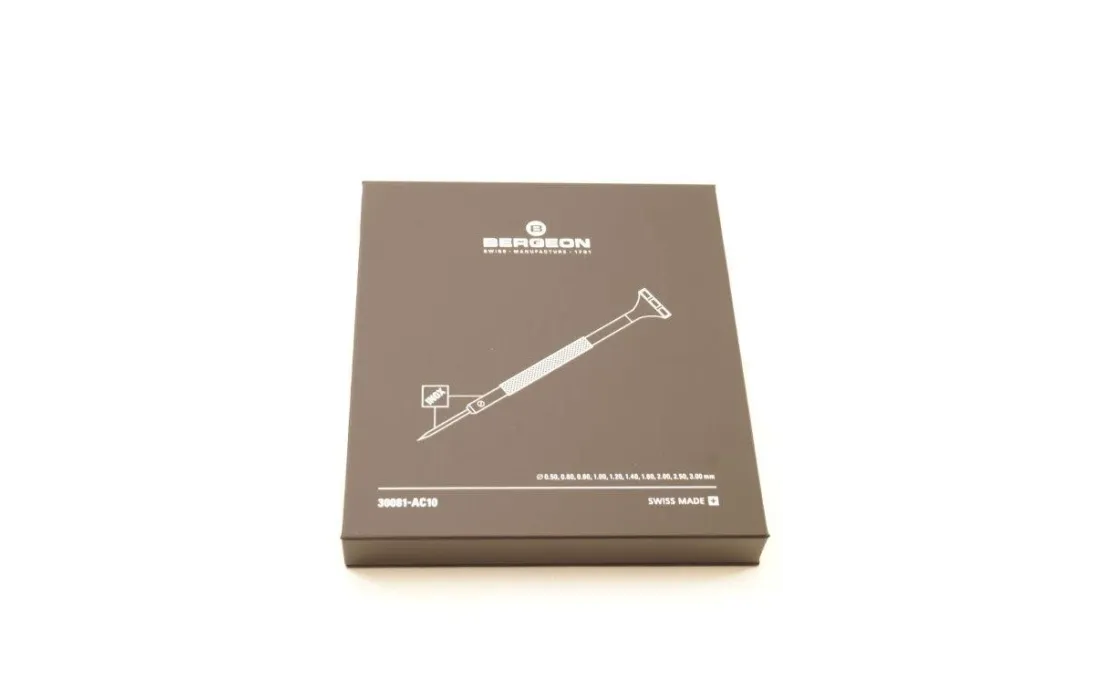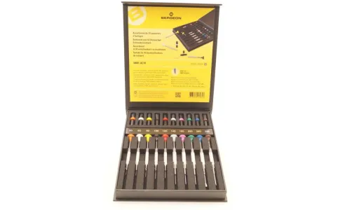 Assortimento di 10 cacciaviti Bergeon completamente in acciaio testa in POM lame di ricambio per ogni diametro. da 0,50 a 3,00 mm