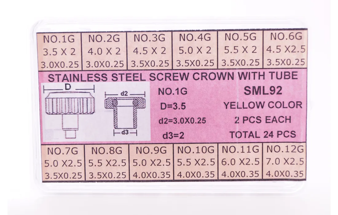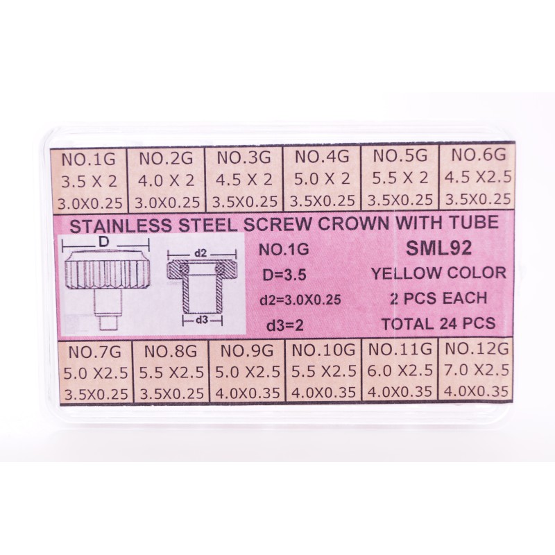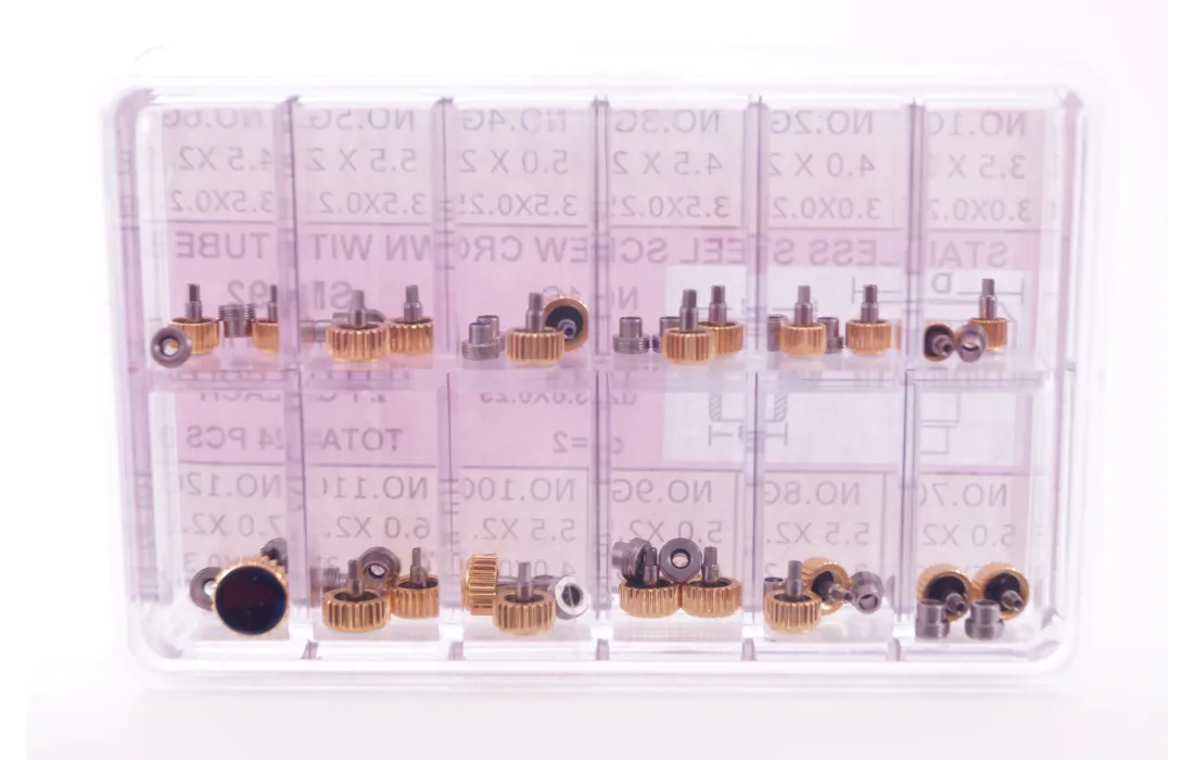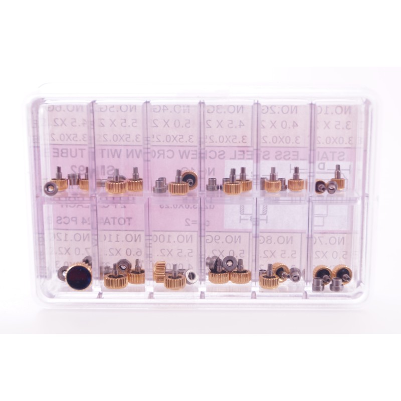 Assortimento di 24 corone in acciaio laminato, complete di canotti e guarnizioni, diametri presenti dal 3,5 al 7,00 mm filetto 0,90