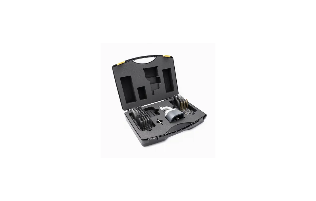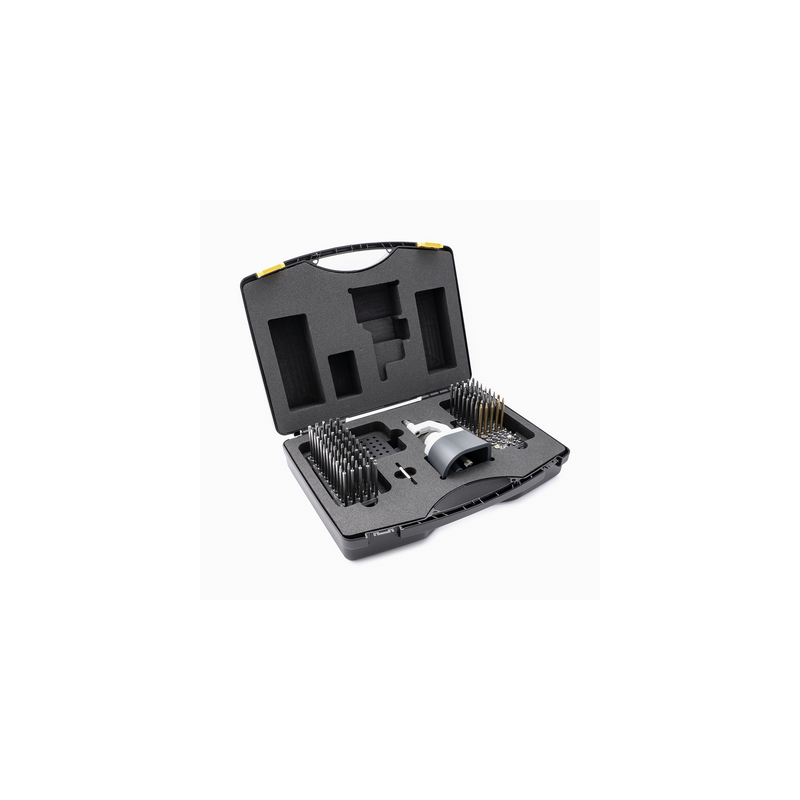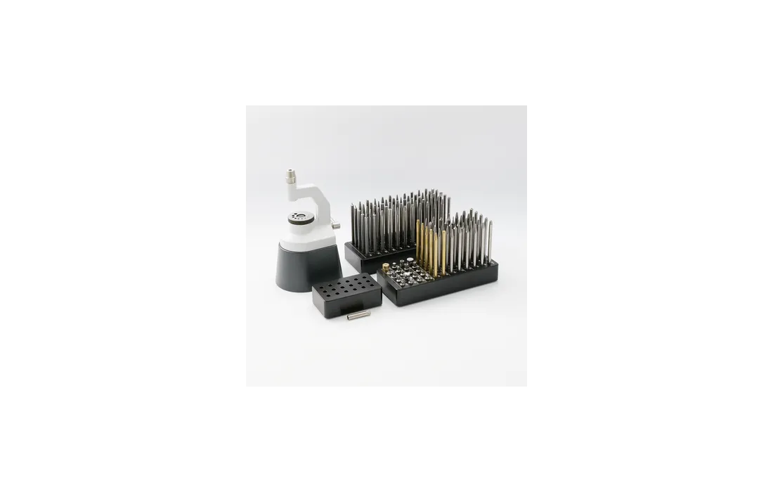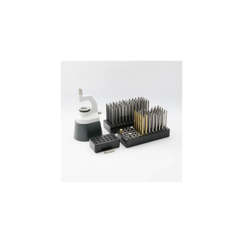 Punzoniera Bergeon, struttura in fusione iniettata, dotata di 100 punzoni, 20 tasselli e zoccolo con vite di regolazione del contro punzone, fornita in una comoda valigia in plex