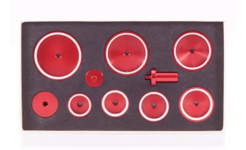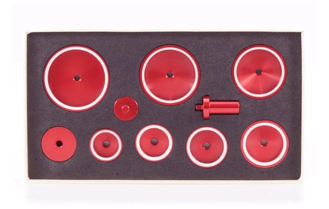 Set di 8 tasselli e 2 attacchi in alluminio con protezione in teflon per il fissaggio delle ghiere/lunette, attacco a vite classico per tutte le potenze Svizzere, diametri presenti da 28 a 55 mm.