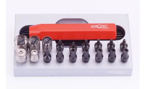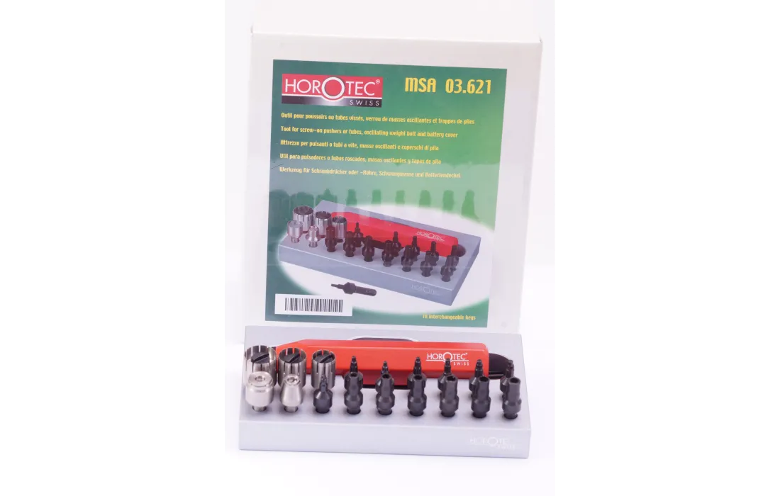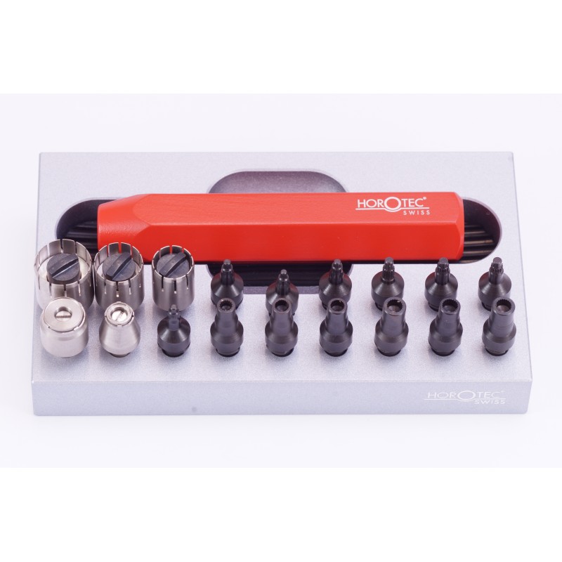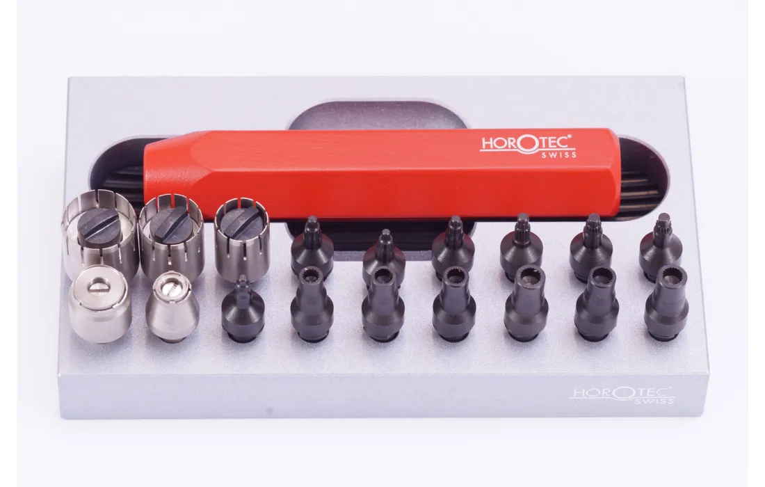 Utensile completo per avvitare/svitare: tutti i canotti della corona Rolex, canotti dei pulsanti, togliere e mettere i cuscinetti delle masse nei cal. ETA 7750-2892-2 e 2001, più i tappi della pila per orologi Swatch