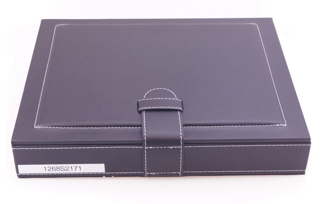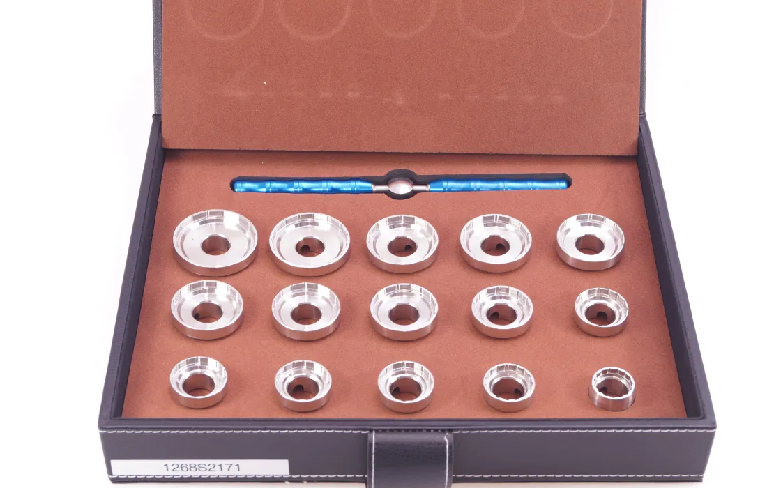 Chiave a manubrio con quindici tasselli in alluminio per apertura orologi Breitling, attacco compatibile anche per chiave a volano Bergeon confezione in similpelle, misure 30 x 25 x 4 cm