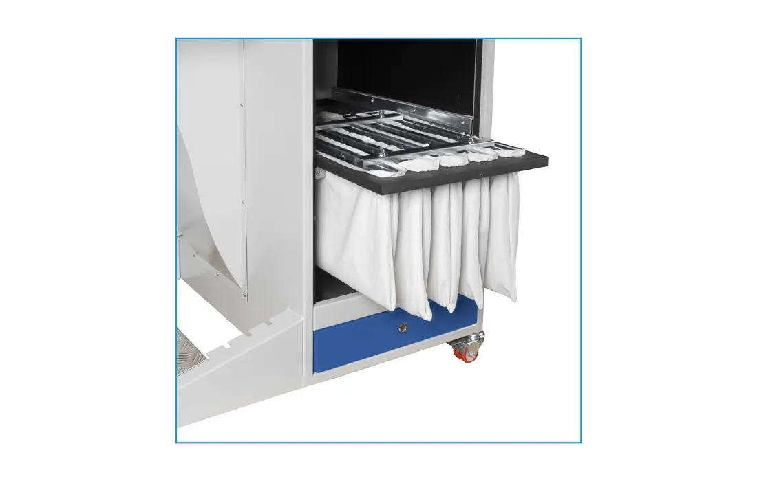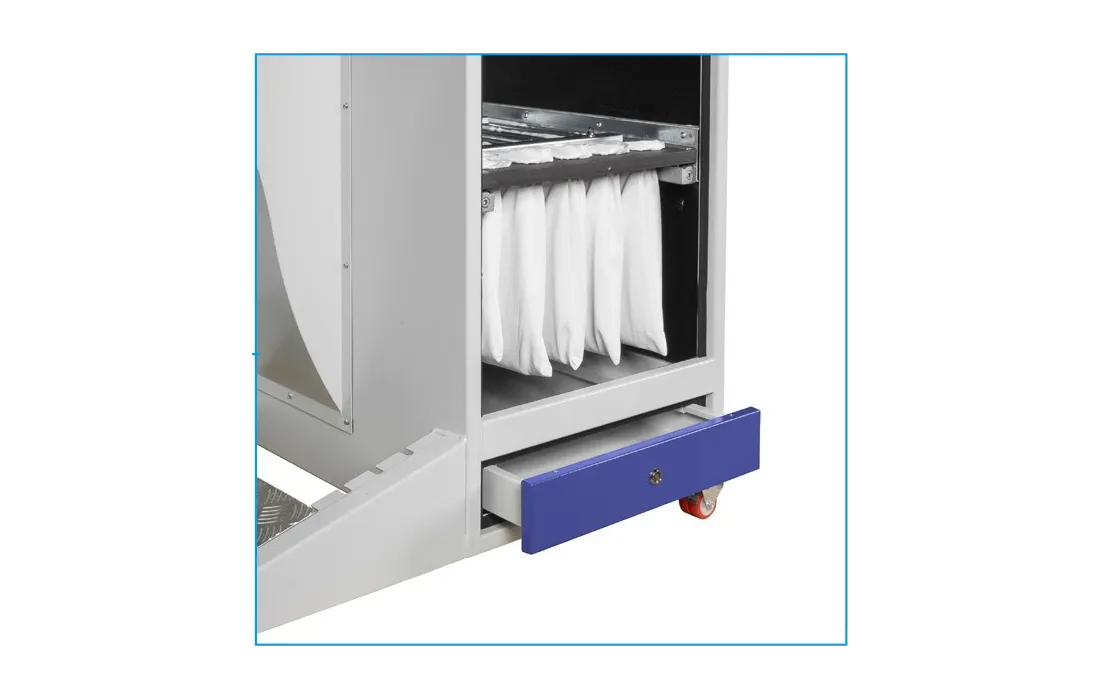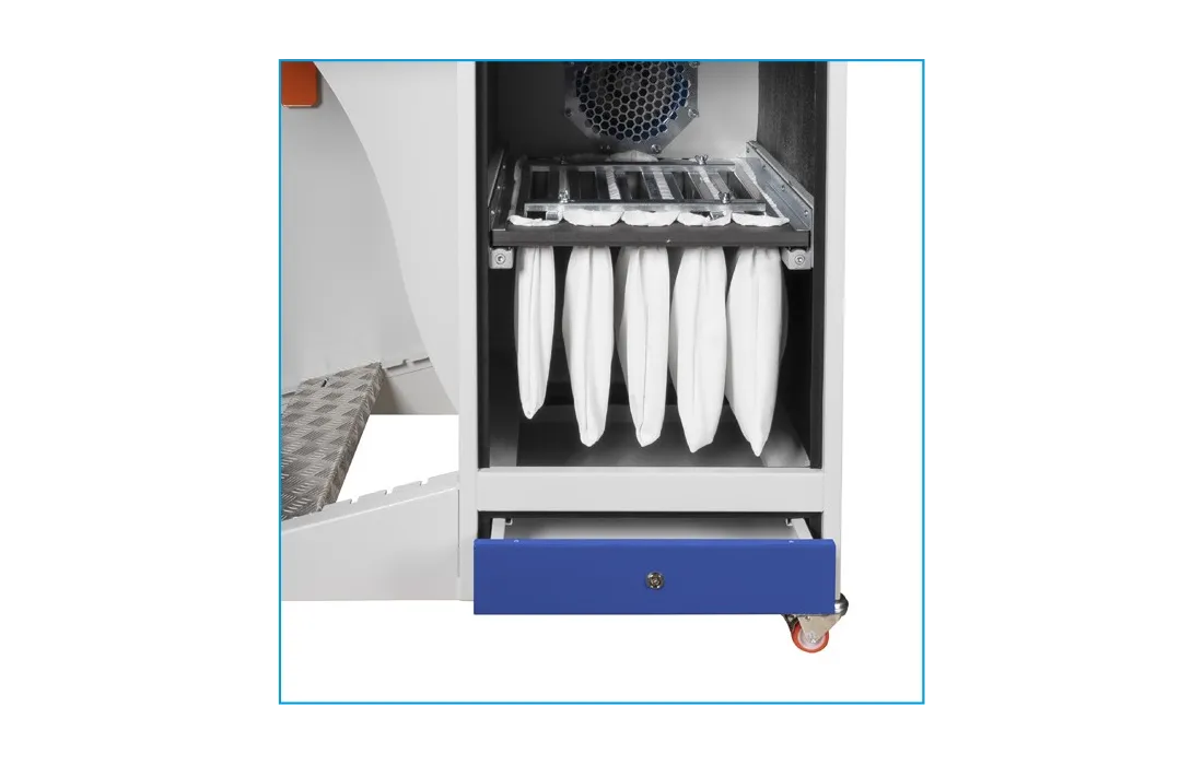 Velocità di rotazione spazzole variabile da 100- a 4000 Rpm - aria aspirata 1500 m3/h - comparto filtri estraibili e con accesso facilitato - cassetto recupero polveri - 5 filtri a tasca in tessuto con filtraggio fino a 0,8 micron - ultimo stadio di filtraggio prima della rimessa in ambiente con filtro ASSOLUTO HEPA Classe H13. Rumorosità a pieno regime 67 dB - albero porta spazzole da 25 mm e relativi distanziatori - coprialbero telescopico - 5 cassetti da 30 cm con altezza da 8, 13 e 26 cm profondità 40 cm su guide telescopiche a cuscinetto, 2 comode prese 230V MF su piano di lavoro. Poggiato su 4 robuste ruote pivottanti con fermo e piede di blocco a vite - pedana poggia piedi in alluminio e regolabile - 2 pulsanti di avviamento distanziati da premere in contemporanea - blocco di emergenza con pulsante a fungo o tramite barra STOP a ginocchio -
