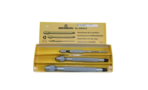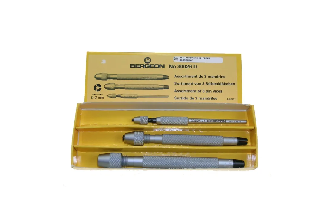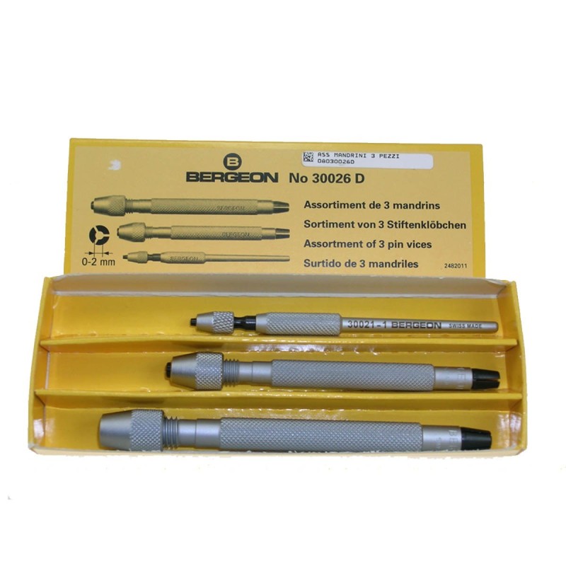 Assortimento di tre mandrini Bergeon corpo in alluminio pinze intercambiabile in acciaio. Da 0 a 2 m/m