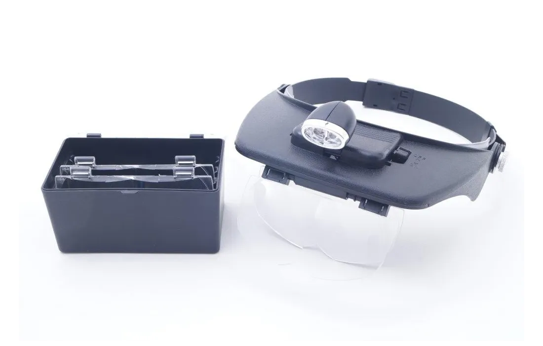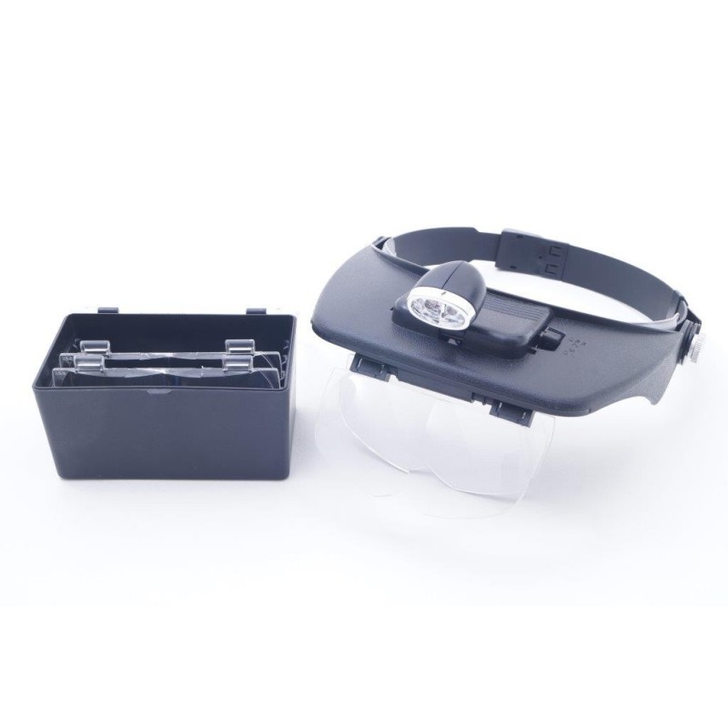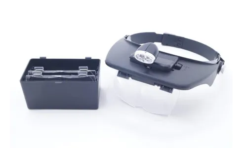 Visiera con lente dotata di 4 lenti di varia gradazione luce a led alimentata con due batterie aaa in dotazione