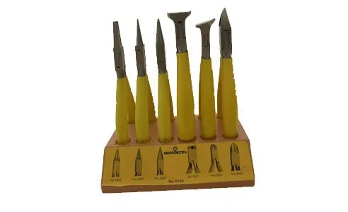Pinze con base in legno 13 x 9 cm con 6 pz /tronchesi.3 pz tronchese con taglio: laterale-obliquo-frontale. 3 pz pinze:piatta zigrinata-tonda zigrinata- mezza tonda zigrinata.