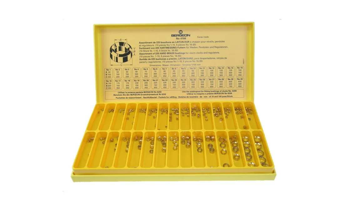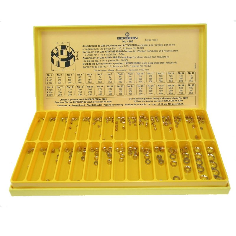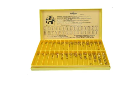 225 pz assortiti in ottone duro. per sveglie e pendoli-riassortibile in sacchetti da 5/10 pz. in base al diametro- divisi per: diametro foro interno. spessore.diametro ex- diametri ex da 2 a 8.5 m/m diam.foro interno da 0.4 a 6.00 m/m