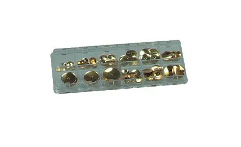 Assortimento di 144 pz ranelle bombate per pendoleria in ottone lucido con foro quadro e tondo