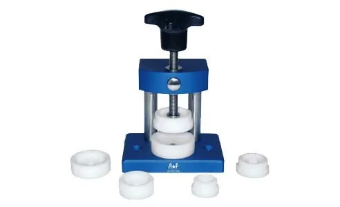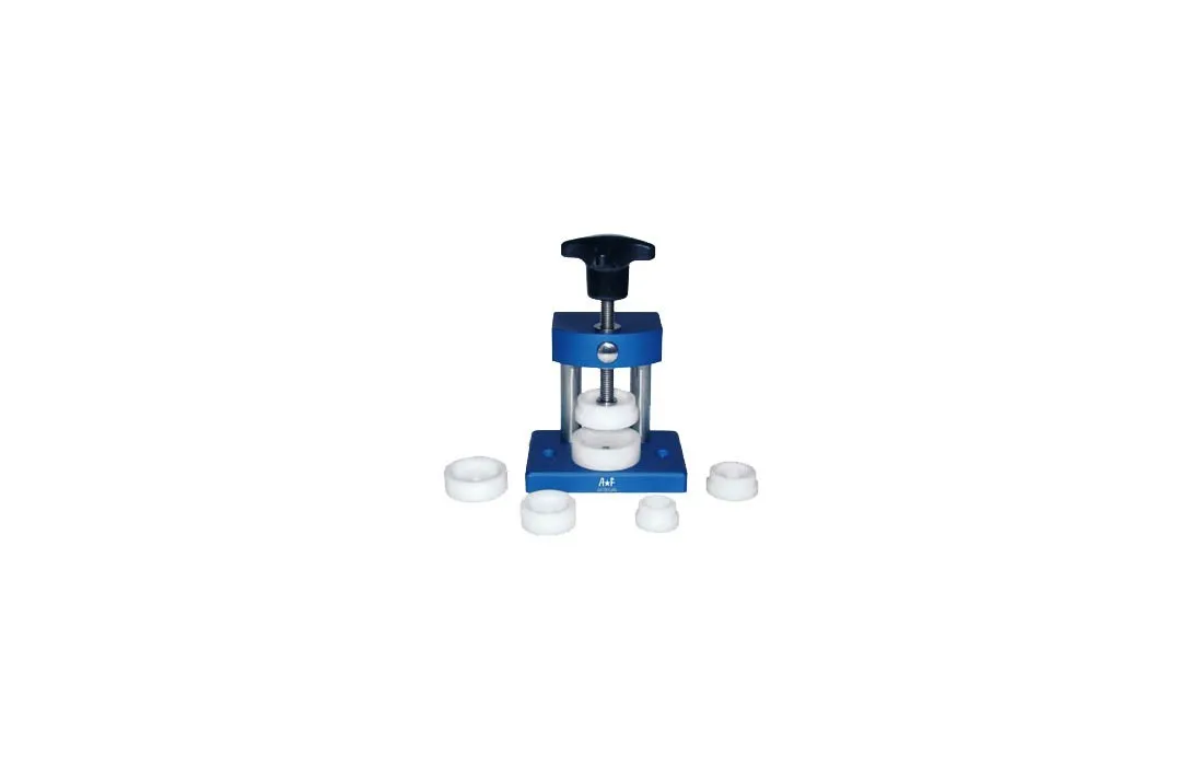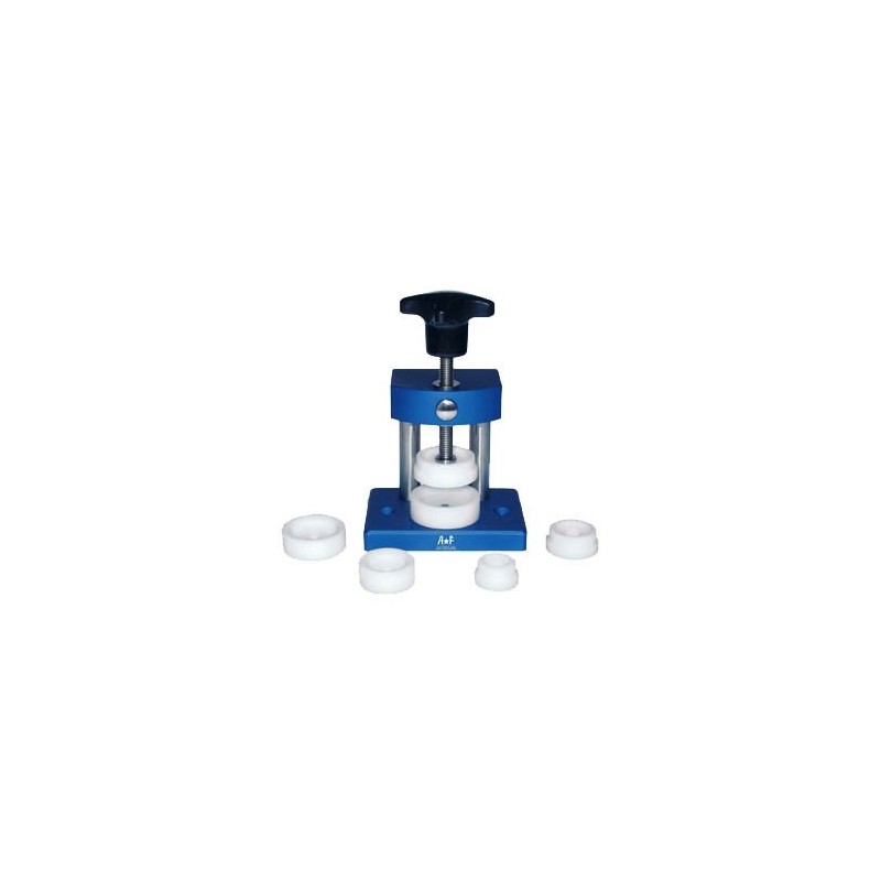 Pressa. in lega leggera. conalbero a vite -e colonne portanti in acciaio inox.più serie di 6 pz tasselli in teflon.per la piazzatura di lunette vetri e chiusura casse a pressione
