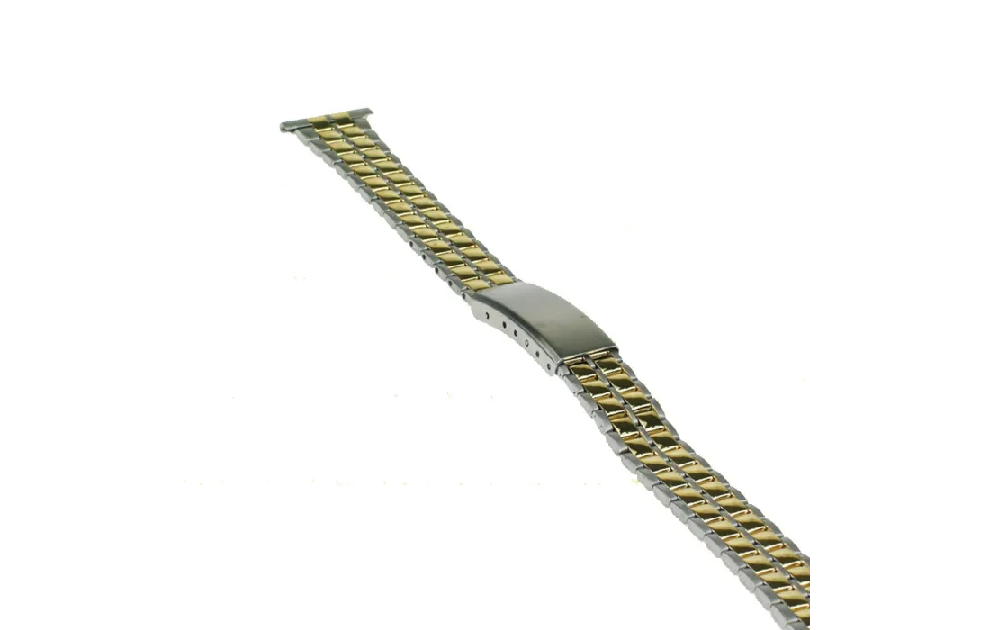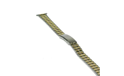A doppia doratura. ansa diritta da 18 m/m corpo bracciale alla prima maglia 14 m/m- accorciabile- chiusura a scatola classica - maglie in acciaio satinate. lucide quelle dorate- rowi made in germany