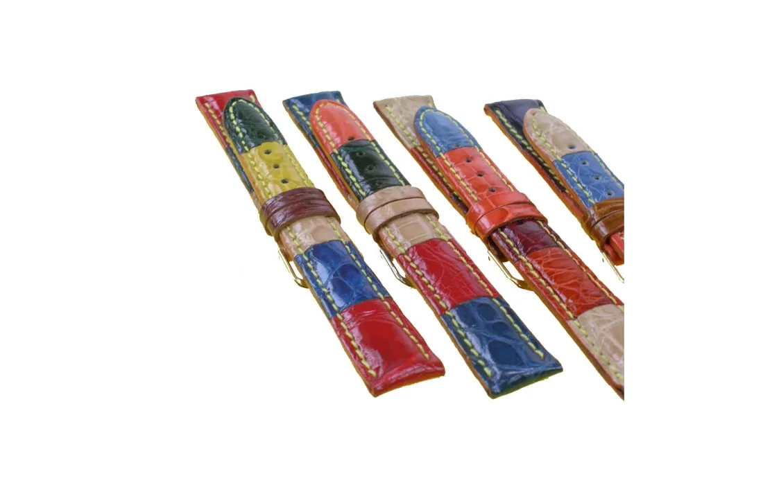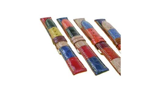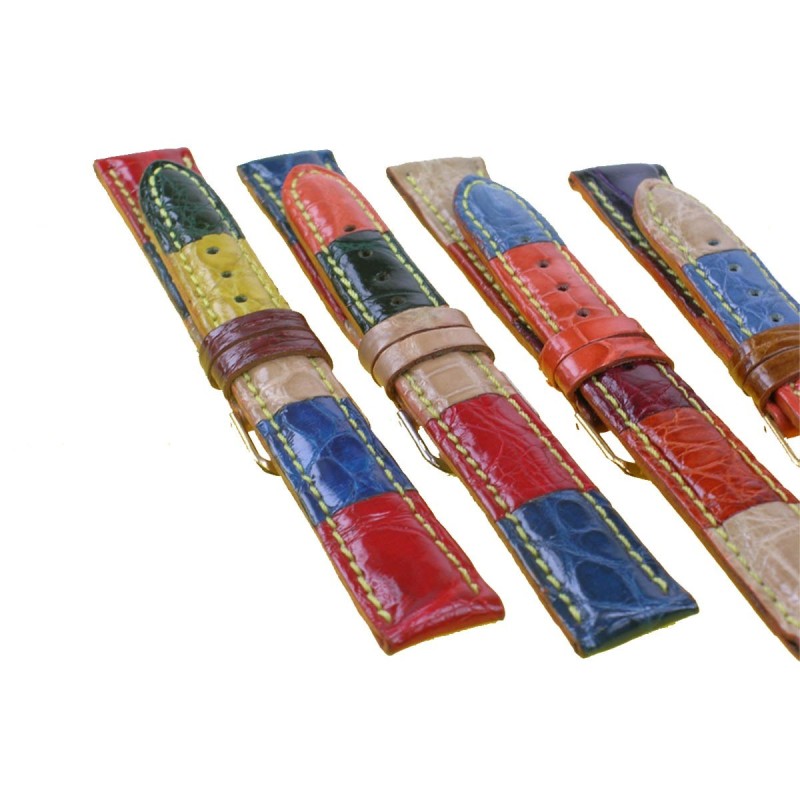 Divertenti colori lucido/opaco in vero coccodrlillo- con bordi semi ribordati- cucitura gialla-manifattura artagianale italiana. disponibili nelle misure 16 e 18 m/m