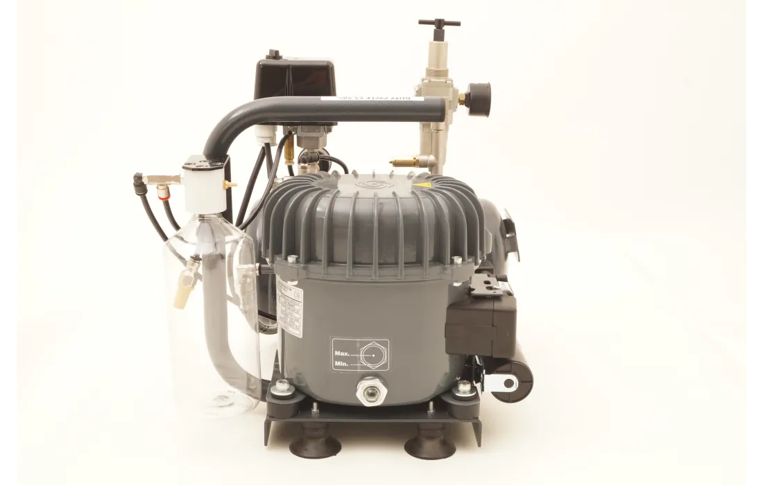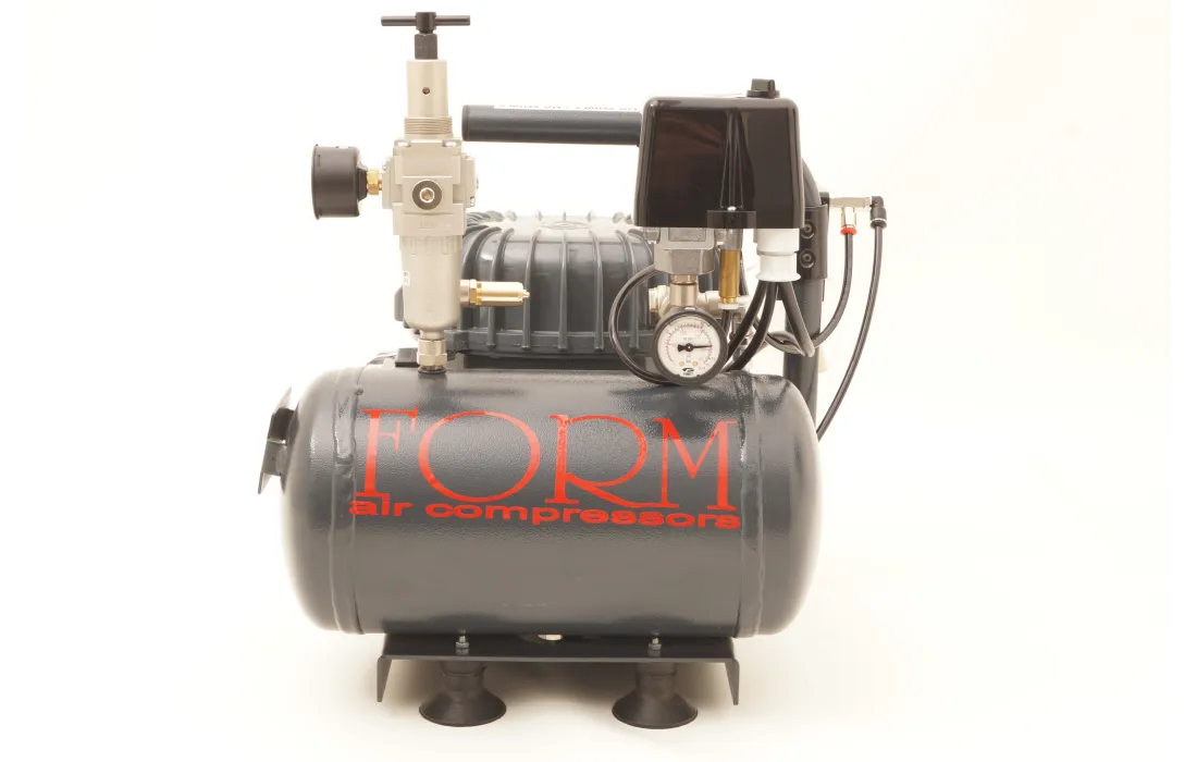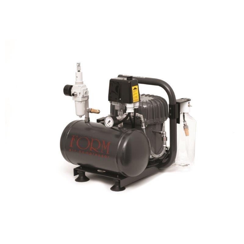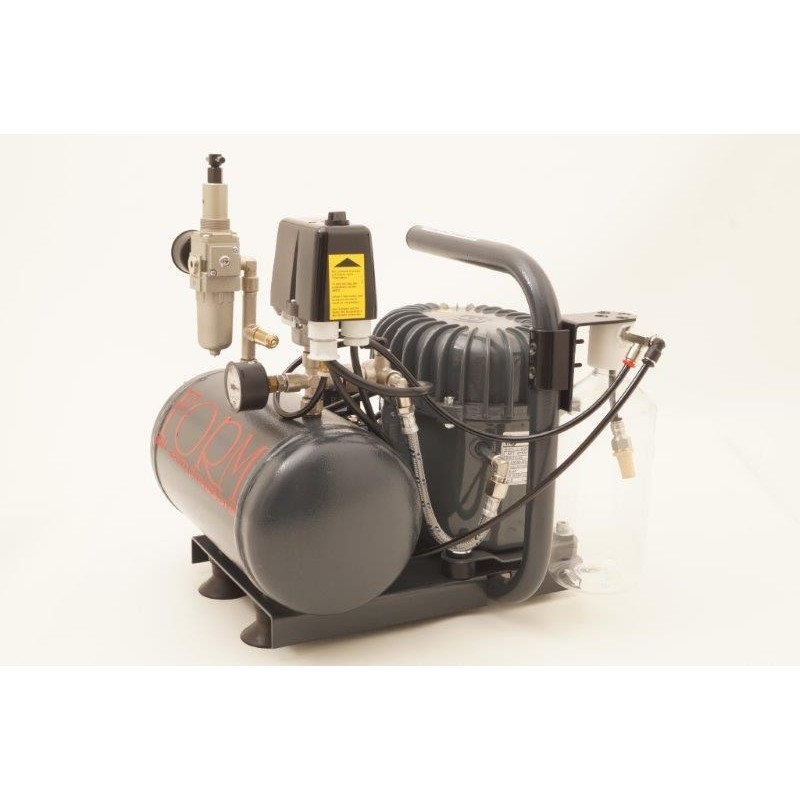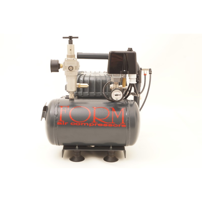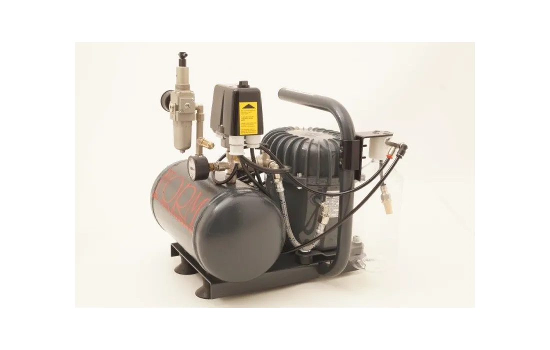 Compressore da 4 litri ad alta pressione a 16 bar silenziato con due manometri filtro anti condensa. auto drenaggio della bombola. e serbatoio di recupero della condensa. certificato icepi dimensioni hlt 35 cm prof 35 cm larg 30 cm peso 21 kg.
