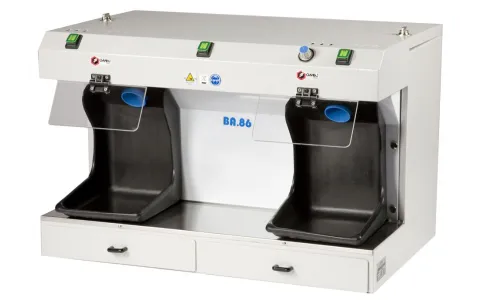 A due aspiratori separati che permettono di avere: due aspiraz.variabili / una fissa ed una variabile / o due fisse.2 luci alogene/2 filtri separati/peso 45 kg. ah 49/lar76/prof49 cm colore di serie bianco volume di aspirazione:aspi.fissa 250 mkh-